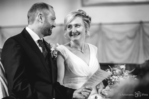 Die kirchliche Hochzeit begann in einer schönen Kirche in Liebethal am Rande der Sächsischen Schweiz. Kirchliche Trauungen sind für Brautpaare immer etwas ganz Besonderes, denn das Ambiente kann man mit einem Standesamt natürlich nicht vergleichen. Alles ist festlicher und von einer ganz bestimmten Atmosphäre geprägt - vor allem dann, als Dana mit ihrem wundervollen und doch schlichten Kleid den Raum erfüllte.