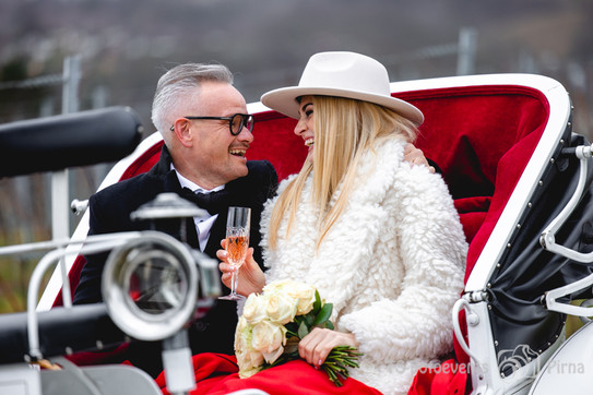 Nach dem anschließenden Sektempfang im großzügigen Empfangsbereich des Hauses fuhren die zwei als kleine Überraschung noch mit einer Hochzeitskutsche zu dem nahegelegenen Weinberg mit herrlicher Aussicht auf die Albrechtsburg Meißen.