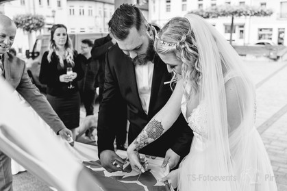 Nach der offiziellen Zeremonie ging es bei einem entspannten Spaziergang auf den Marktplatz, auf dem dann ein hübscher kleiner Sektempfang mit Baumstammsägen und kleinen Canapés stattfand. Dabei konnte ich wieder viele schöne Aufnahmen aus der Distanz machen - ohne das Brautpaar und die Gäste zu stören.